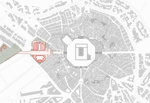 The scheme proposes a long list of architectural, infrastructure and landscape interventions, and has now been adopted. Some are large, involving a new rail station, theological college, a large new mosque, and dining hall for 10,000 people. However others are small at the level of the courtyard, house and pocket-park. One urban element, sometimes a wall, sometimes a complex building, encircles and filters movement to the shrine. The scheme carefully protects and supports the existing ancient medina.